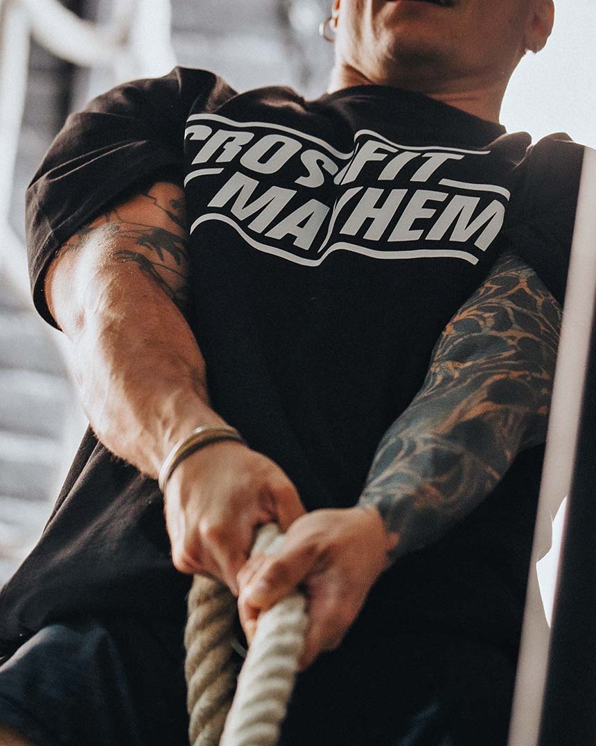 Crossfit women wearing Mayhem x Northern Spirit t-shirt in a gym